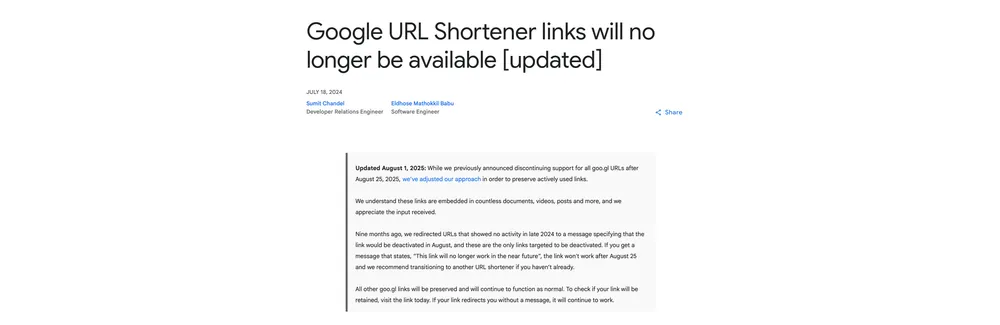 Updated August 1, 2025: While we previously announced discontinuing support for all goo.gl URLs after August 25, 2025, we've adjusted our approach in order to preserve actively used links.