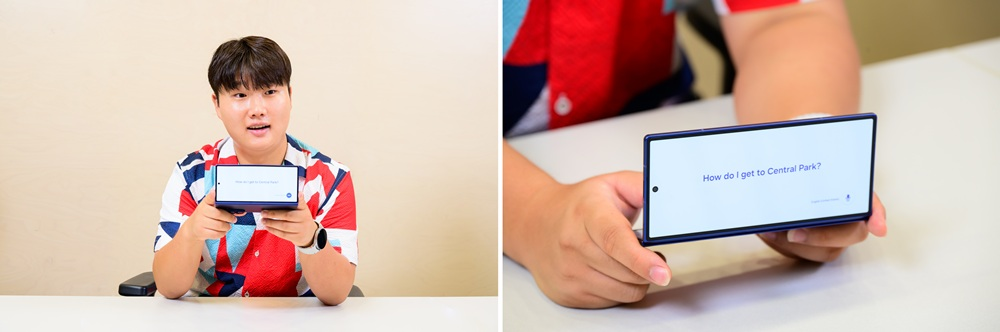 - Intérprete mediante teclado: Esta función, impulsada por la inteligencia artificial de Galaxy AI, permite traducir texto en tiempo real. El usuario escribe una frase en su idioma y el dispositivo genera una traducción instantánea en texto y voz, mostrando ambas versiones en la pantalla. Ideal para situaciones donde la comunicación verbal es difícil debido al ruido o a la pronunciación.