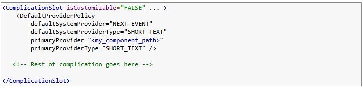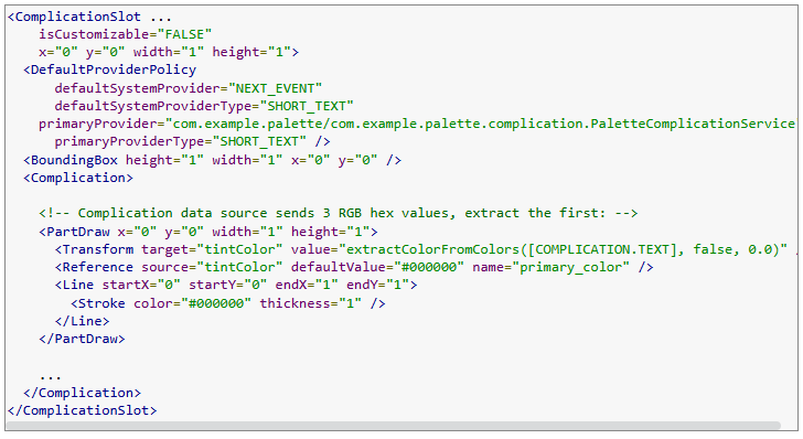 Luego, puedes usar el elemento REFERENCE para definir colores y utilizarlos en cualquier parte de la esfera, incluso fuera del ComplicationSlot.