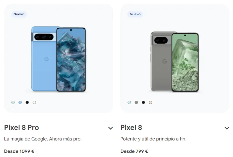 - Pixel 8: Sensor principal de 50MP y un ultra gran angular de 12MP, ofreciendo fotos y vídeos de alta calidad con la magia del software de Google.